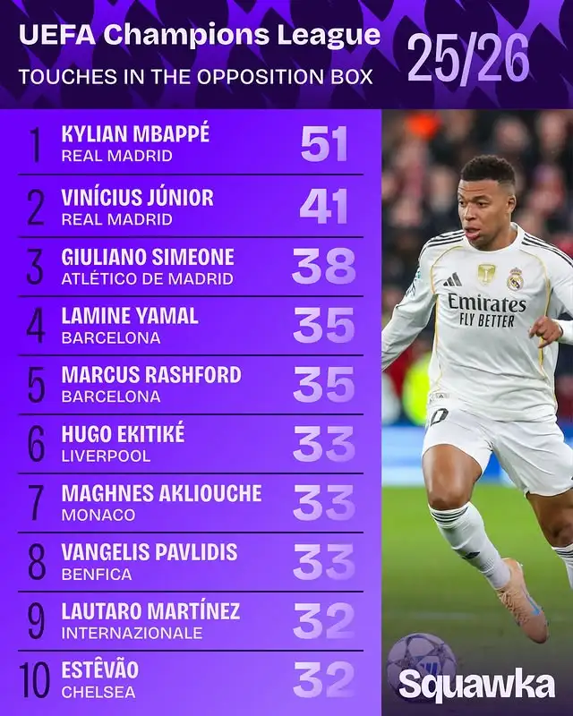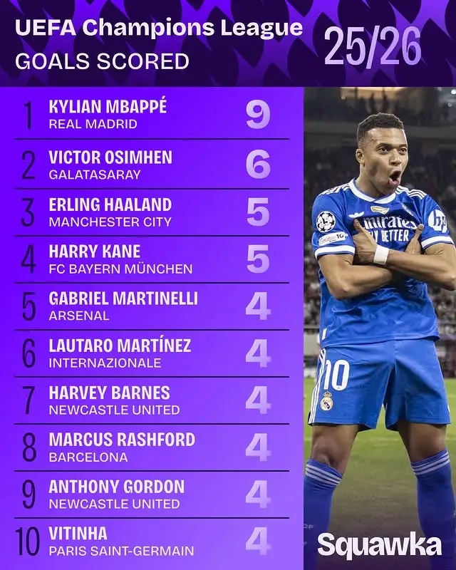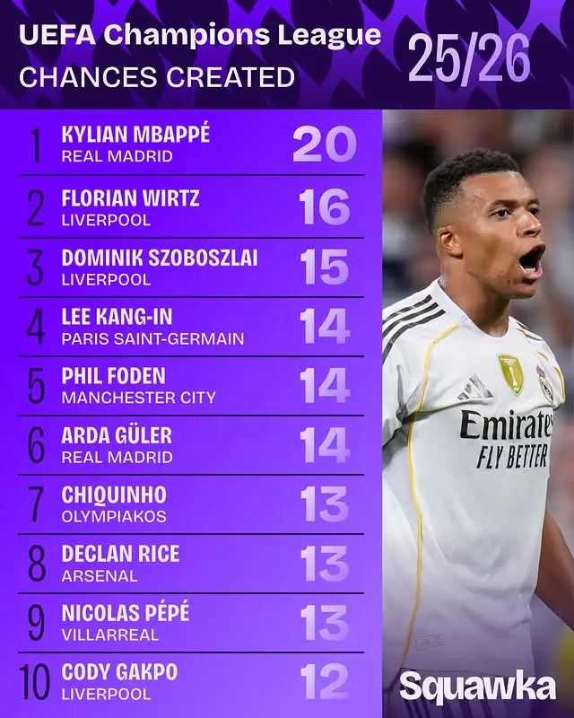 Squawka數據統計,季歐姆巴佩在本賽季至今歐冠中的冠進(jìn)進(jìn)球、射門(mén)、球射創(chuàng )造機會(huì )次數等5項數據均位列參賽球員首位: