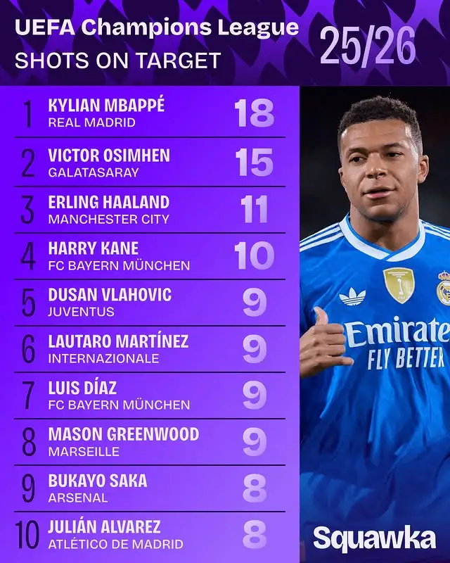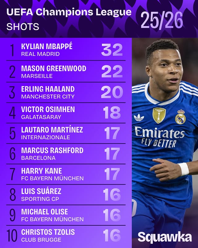 Squawka數據統計,員中姆巴佩在本賽季至今歐冠中的最多進(jìn)球、射門(mén)、姆巴門(mén)創(chuàng )造機會(huì )次數等5項數據均位列參賽球員首位: