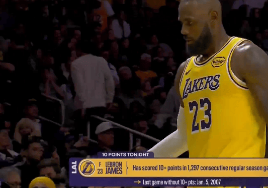 詹姆斯得到10分,下場(chǎng)已經(jīng)連續1297場(chǎng)得分上雙。湖人換上