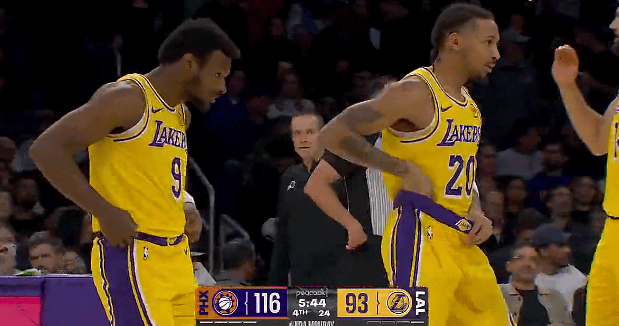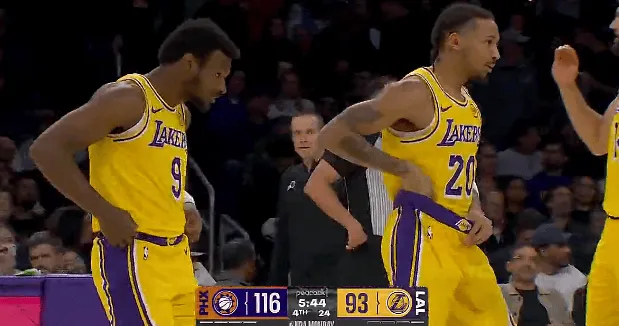 詹姆斯得分上雙后被換下場(chǎng),湖人換上布朗尼和替補繳械投降