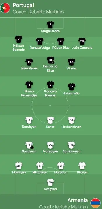 葡萄牙首發(fā):1-迪奧戈-科斯塔、2-塞梅多、13-維加、3-魯本-迪亞斯、20-坎塞洛、15-內維斯、10-B席、23-維蒂尼亞、8-B費、9-貢薩洛-拉莫斯、17-萊奧