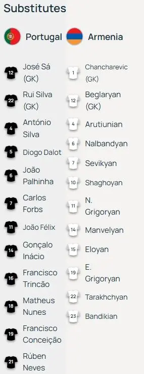 葡萄牙替補:12-若澤-薩、22-魯伊-席爾瓦、4-安東尼奧-席爾瓦、5-達洛特、6-帕利尼亞、7-博爾赫斯、11-菲利克斯、16-伊納西奧、16-特林康、18-努內斯、19-孔塞桑、21-魯本-內維斯