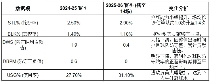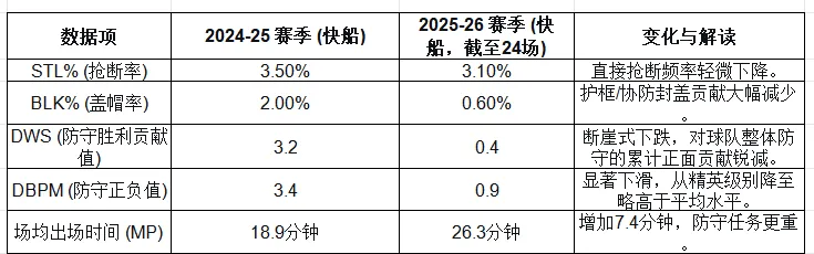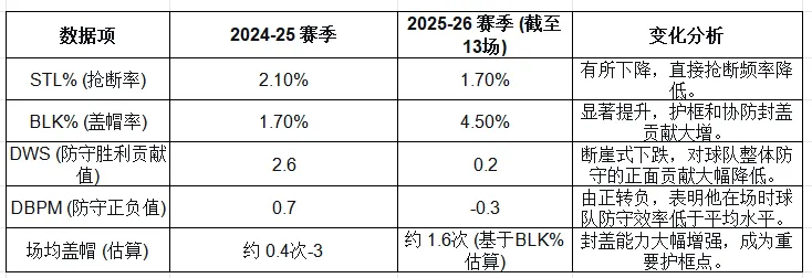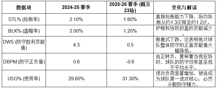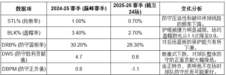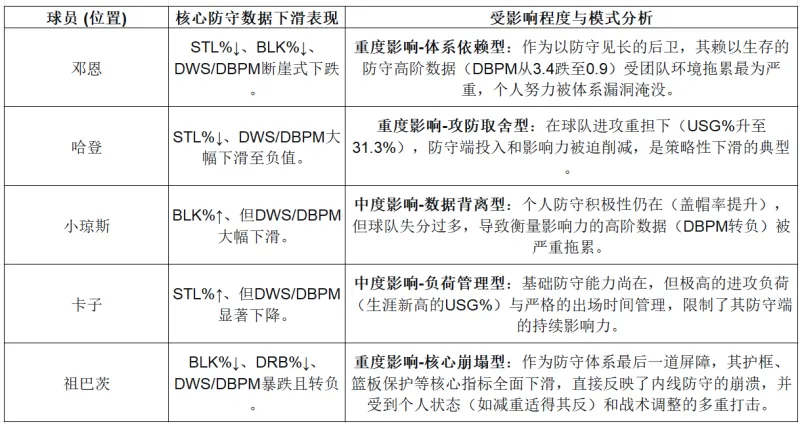 結論:球隊將大量戰術(shù)資源和球員體能傾斜于填補進(jìn)攻缺口(卡子、哈登的USG%創(chuàng )生涯新高),導致在防守端“心有余而力不足”。