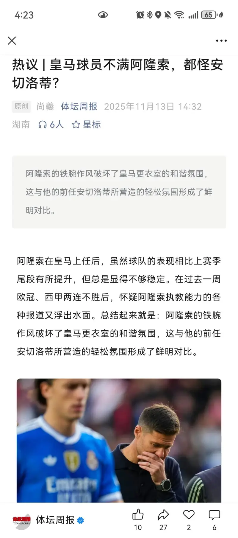 球星要的是舒適,然后心情好了吃著(zhù)火鍋唱著(zhù)歌把球贏(yíng)了,這是皇馬的傳統文化,事實(shí)證明是行之有效的。阿隆索在皇馬踢過(guò)球,他不懂嗎?現在按照個(gè)人意愿強行改變傳統,小心被做掉。