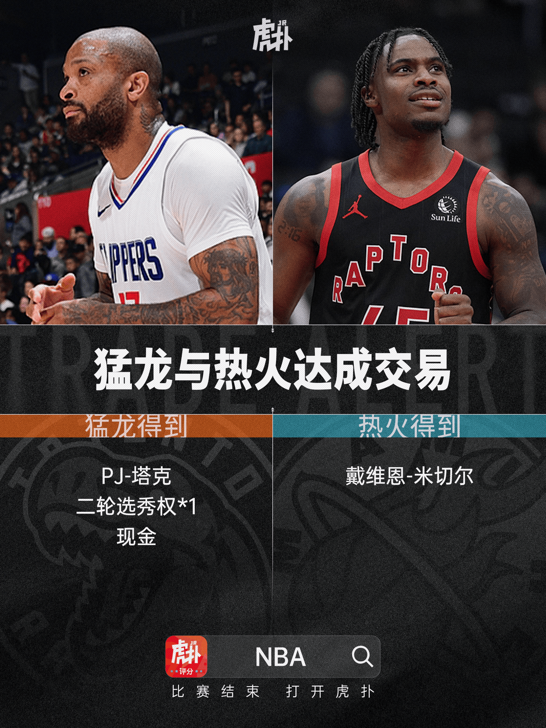 虎撲02月07日訊 根據Shams Charania的報道,猛龍將戴維恩-米切爾送到熱火,板猛得到PJ-塔克,流言龍一個(gè)次輪和現金。板猛