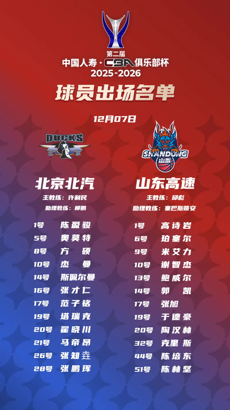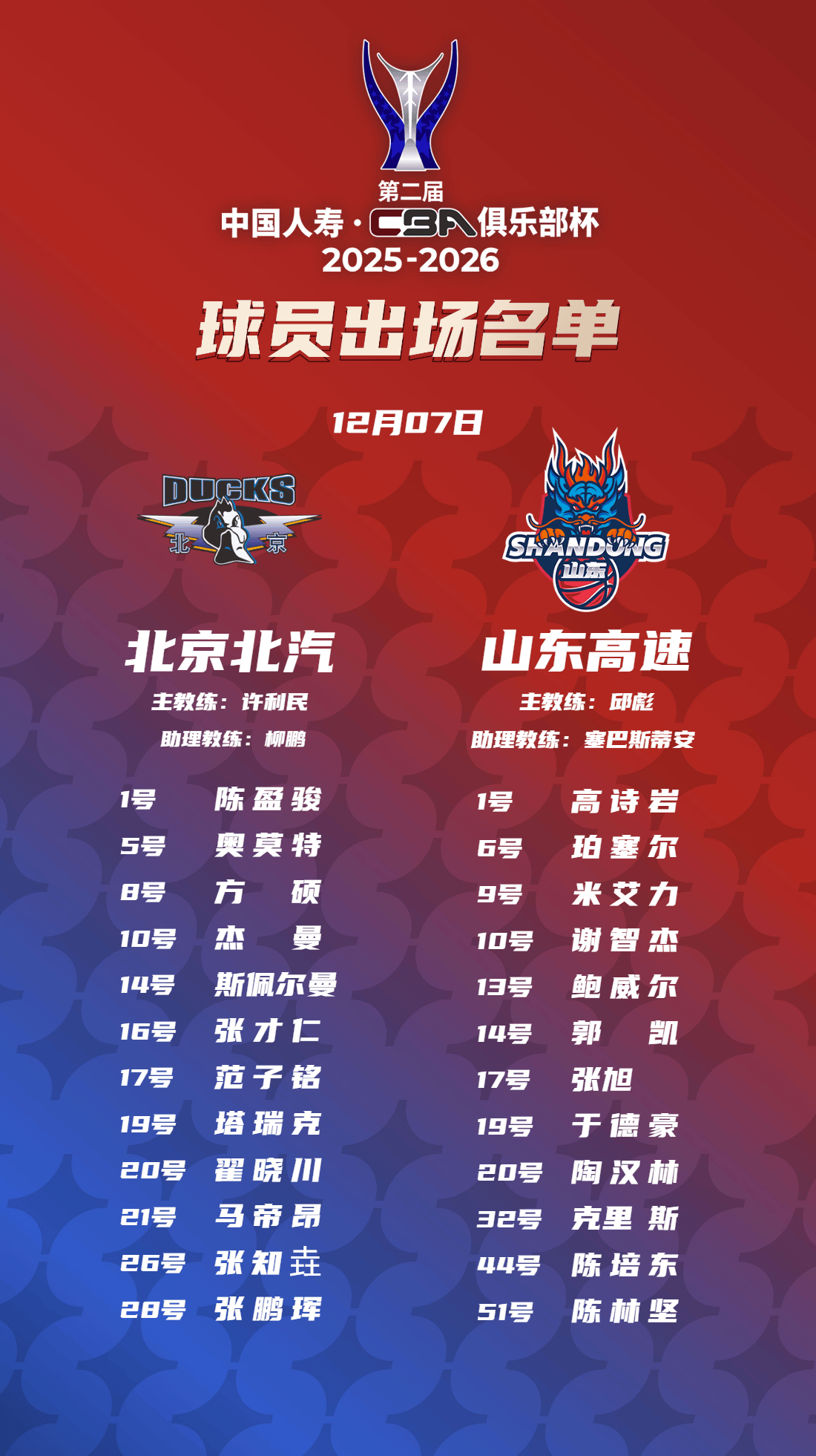 虎撲12月07日訊 今日CBA俱樂(lè )部杯,北京vs山東大名單已經(jīng)出爐。名單