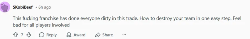 -這個(gè)該死的球隊在那次交易中把所有人都害慘了。如何一步到位毀掉自己的球隊。為所有相關(guān)球員感到難過(guò)
