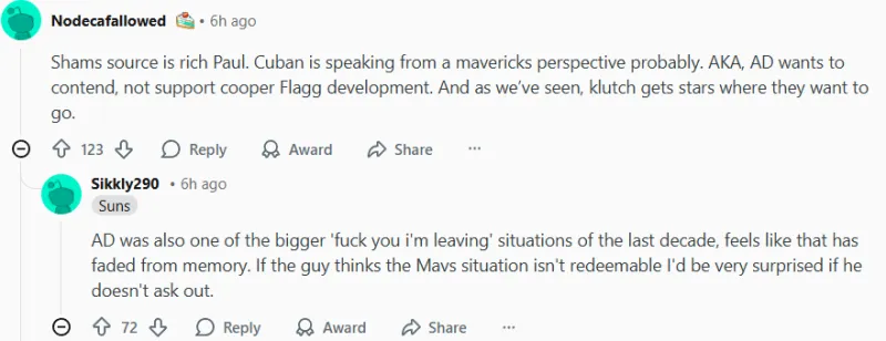 -(123贊)Shams的消息來(lái)源是富保羅。庫班可能是站在獨行俠的角度說(shuō)話(huà)。AD想要爭冠,而不是支持庫珀-弗拉格的發(fā)展。正如我們所看到的,Klutch能把球星帶到他們想去的地方。