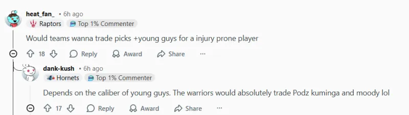 -(18贊)球隊會(huì )愿意用選秀權和年輕球員去換一個(gè)容易受傷的球員嗎?
