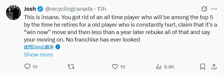 -(19贊)這簡(jiǎn)直瘋了。你們甩掉了一位歷史級球員,他退役時(shí)絕對能躋身歷史前五,卻換來(lái)一個(gè)傷病纏身的過(guò)氣老將,還宣稱(chēng)這是"贏(yíng)在當下"的操作,結果不到一年就推翻所有承諾,聲稱(chēng)要另起爐灶。沒(méi)有任何一支球隊曾如此荒唐。