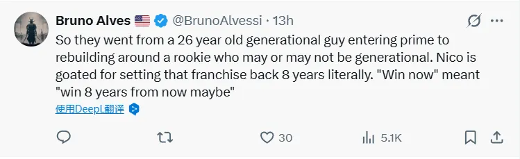 -(30贊)于是他們從圍繞一位26歲正值巔峰的時(shí)代級球員建隊,轉為圍繞一位未必能成為史詩(shī)級的新秀重建。尼科被罵得狗血淋頭,因為他讓球隊倒退了整整八年。"贏(yíng)在當下"的口號,最終變成了"八年后或許能贏(yíng)"。