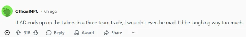 -(318贊)如果AD最終在三方交易中加盟湖人,我甚至不會(huì )生氣。我會(huì )笑得合不攏嘴。
